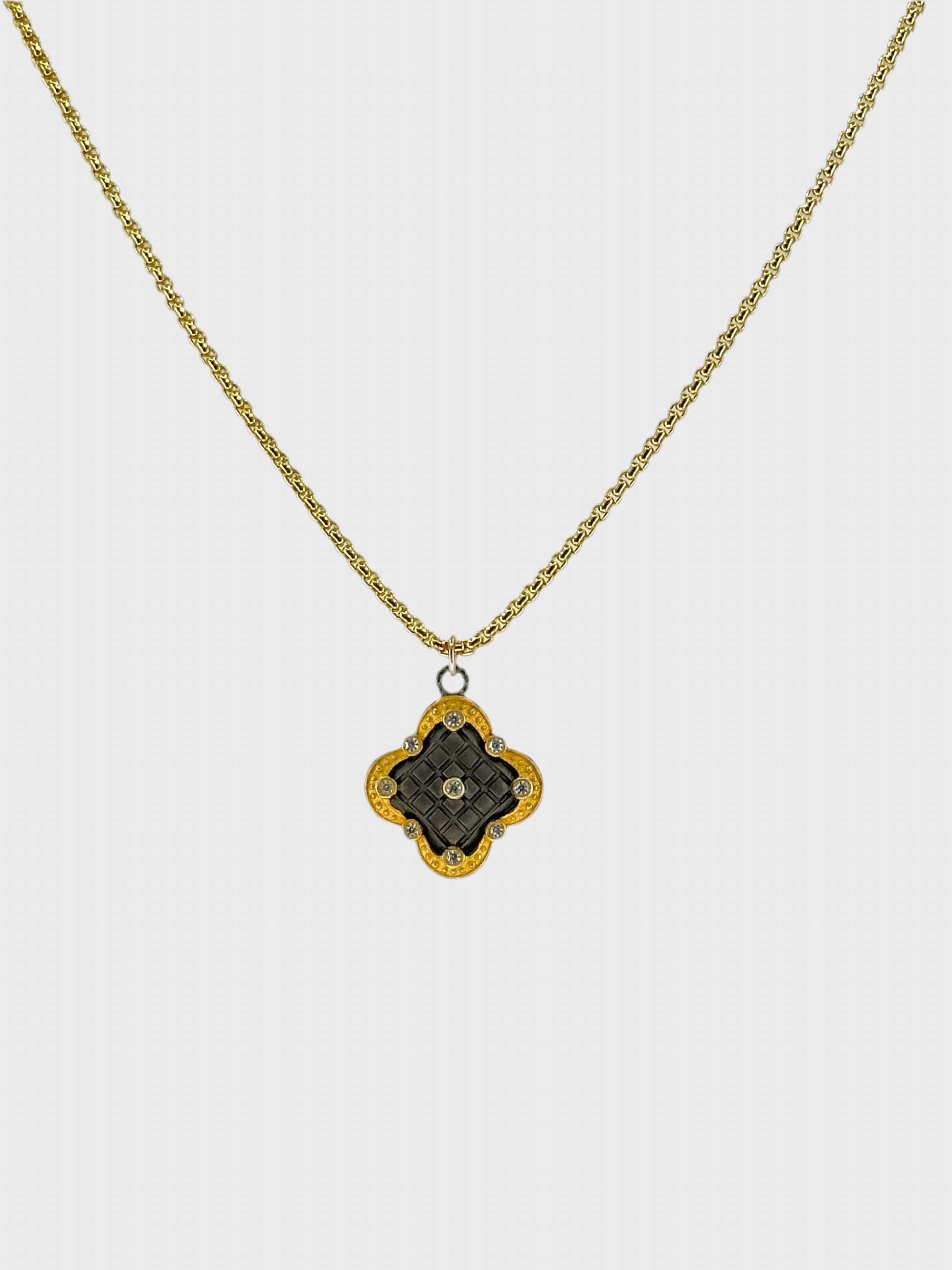 A stunning gold-filled, rounded Venetian box chain, paired with a Moroccan inspired 22k gold vermeil pendant featuring a black textured center and sparkling accents. Perfectly versatile, it works for date night and your little black dress.