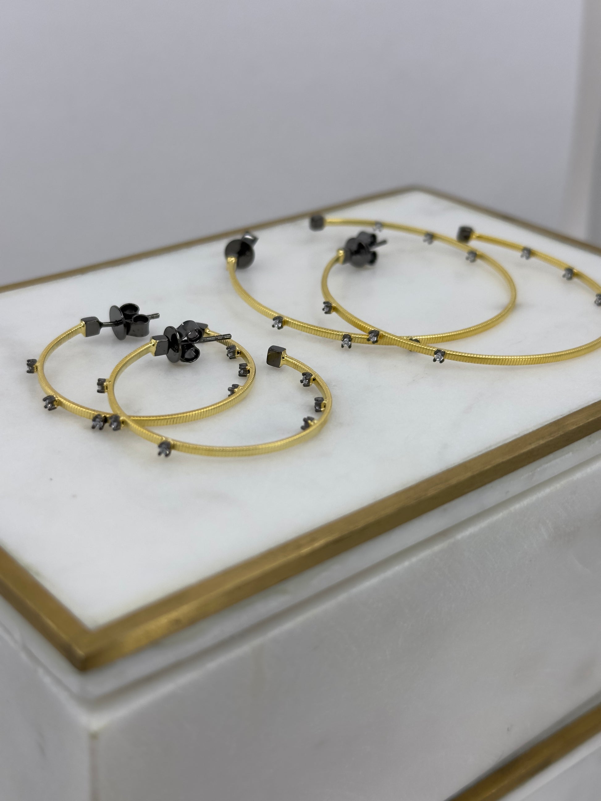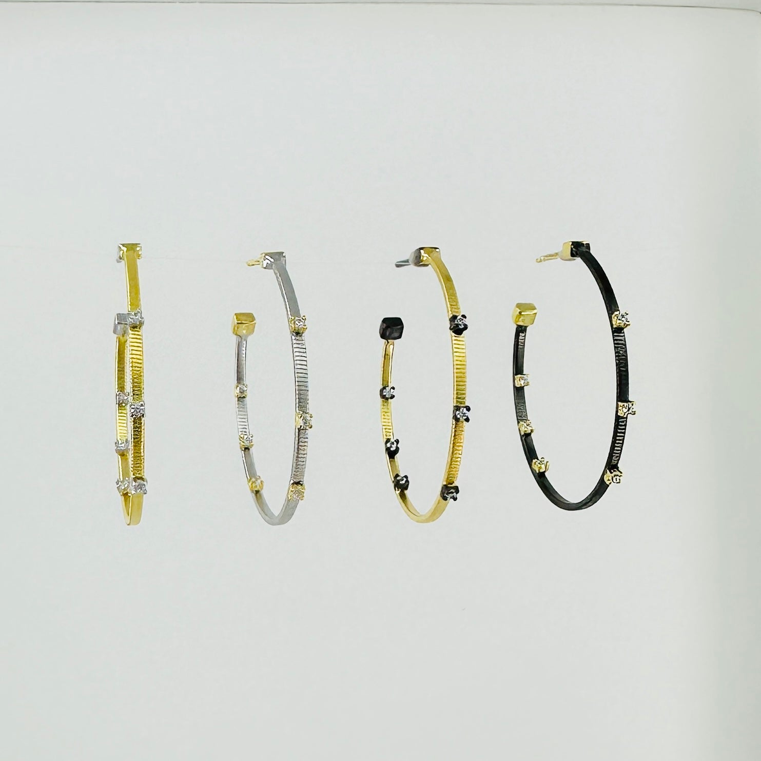 These 1.25” hoops feature a textured finish that adds dimension, with CZs set along the front and inside back, giving a doubled sparkle effect from every angle. Elegant and eye-catching, these hoops make a versatile addition to any jewelry collection.